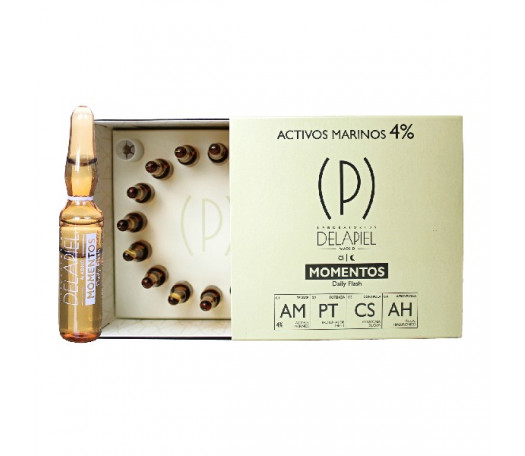 Ampollas flash de uso diario. Ideal para fijar y potenciar los efectos del maquillaje o para dar un aspecto espléndido a tu piel natural. Con activos marinos, proteínas de trigo, ceratonia siliquia y ácido hialurónico.